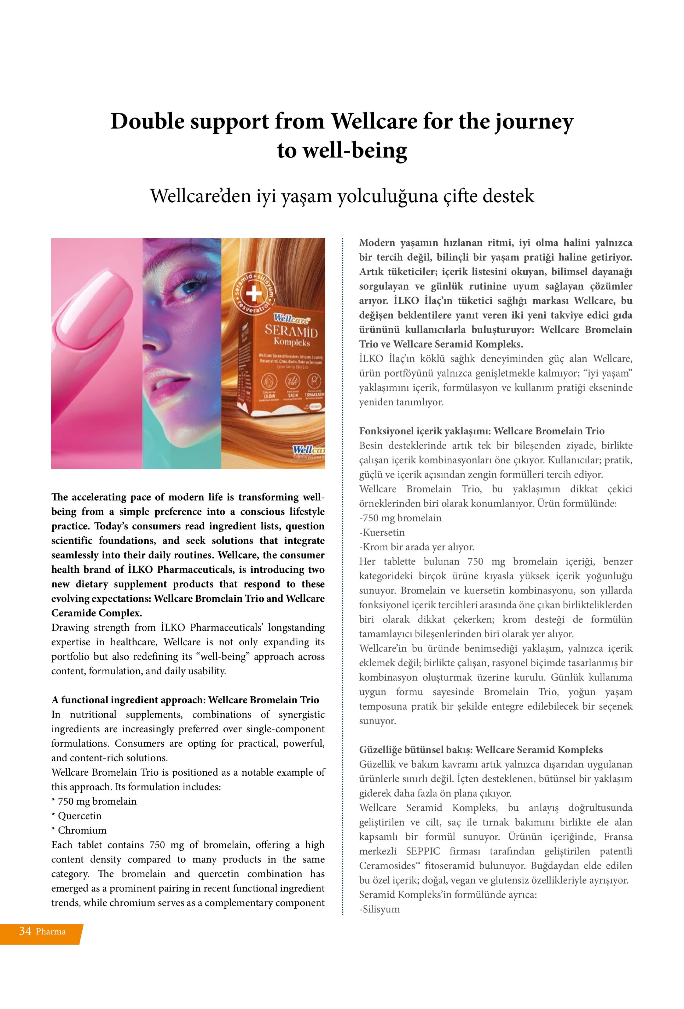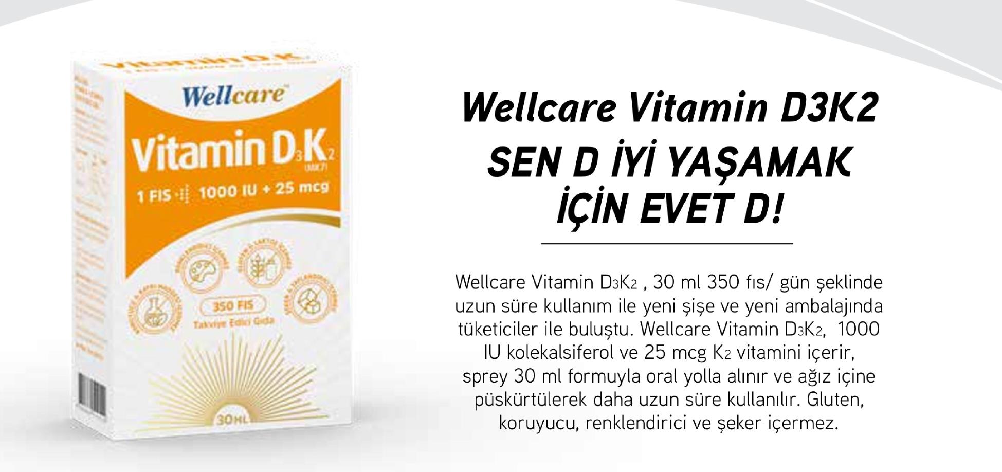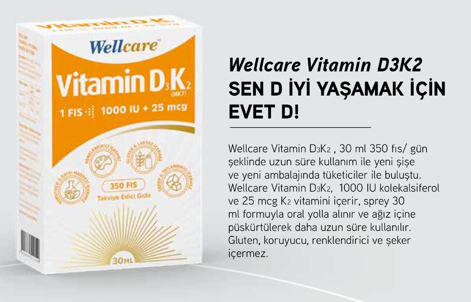 Wellcare Vitamin D₃K₂ , 30 ml 350 fıs/ gün şeklinde uzun süre kullanım ile yeni şişe ve yeni ambalajında tüketiciler ile buluştu. Wellcare Vitamin D₃K₂, 1000 IU kolekalsiferol ve 25 mcg K₂ vitamini içerir, sprey 30 ml formuyla oral yolla alınır ve ağız içine püskürtülerek daha uzun süre kullanılır. Gluten, koruyucu, renklendirici ve şeker içermez.