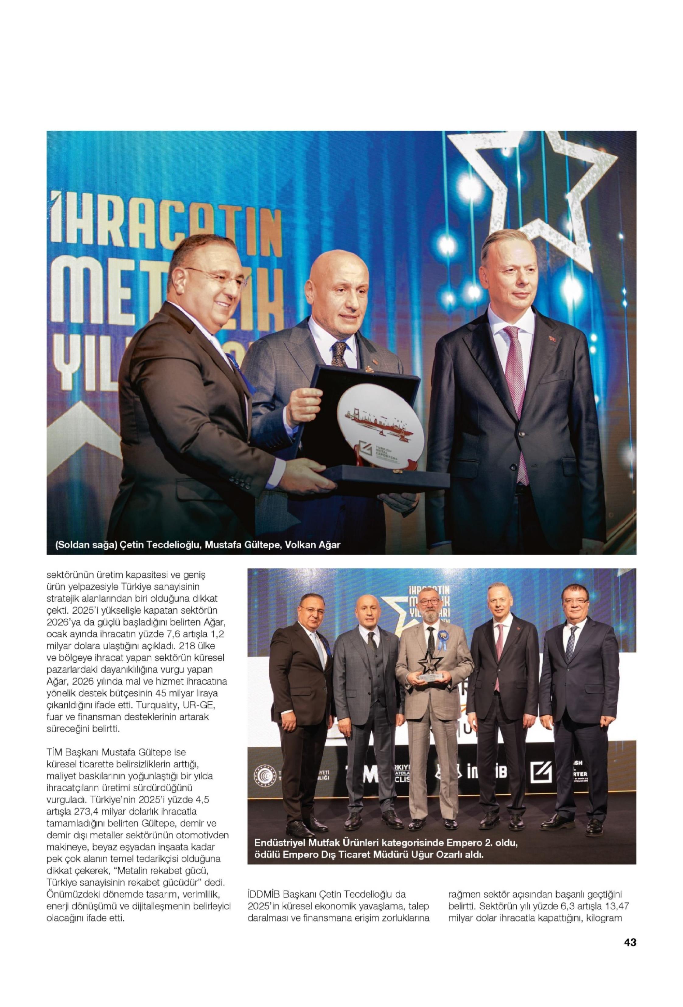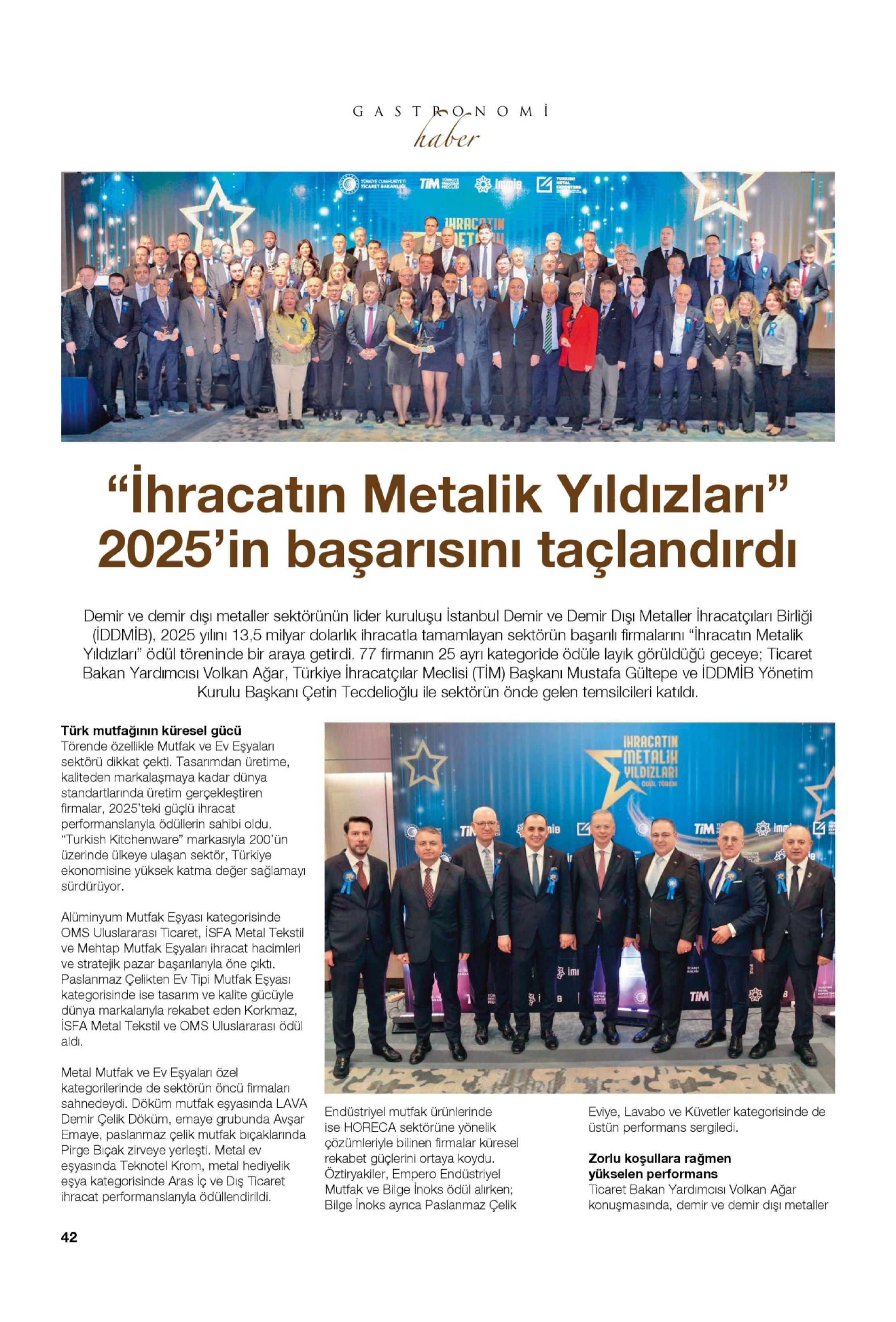 İstanbul Demir ve Demir Dışı Metaller İhracatçıları Birliği (İDDMİB), zorlu piyasa koşullarına rağmen 2025 yılını 13,5 milyar dolarlık ihracatla tamamlayan sektörün başarılı firmalarını ''İhracatın Metalik Yıldızları'' ödül töreninde bir araya getirdi. Alüminyum Mutfak Eşyası kategorisinde OMS Uluslararası Ticaret, İSFA Metal Tekstil ve Mehtap Mutfak Eşyaları ihracat hacimleri ve stratejik pazar başarılarıyla öne çıktı.