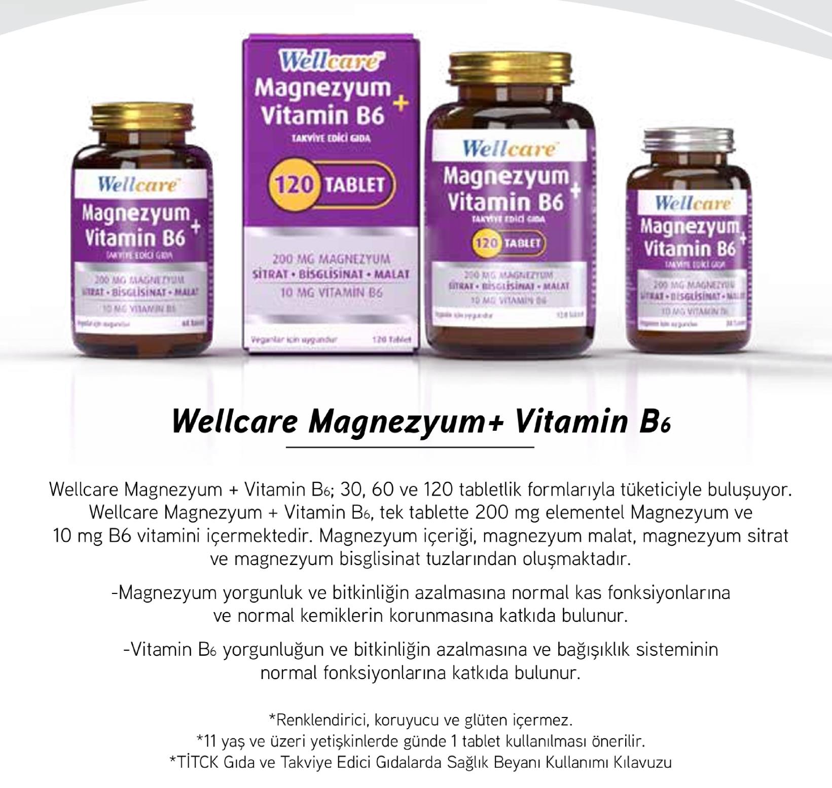 Wellcare Magnezyum + Vitamin B₆; 30, 60 ve 120 tabletlik formlarıyla tüketiciyle buluşuyor. Wellcare Magnezyum + Vitamin B₆, tek tablette 200 mg elementel Magnezyum ve 10 mg B6 vitamini içermektedir. Magnezyum içeriği, magnezyum malat, magnezyum sitrat ve magnezyum bisglisinat tuzlarından oluşmaktadır.