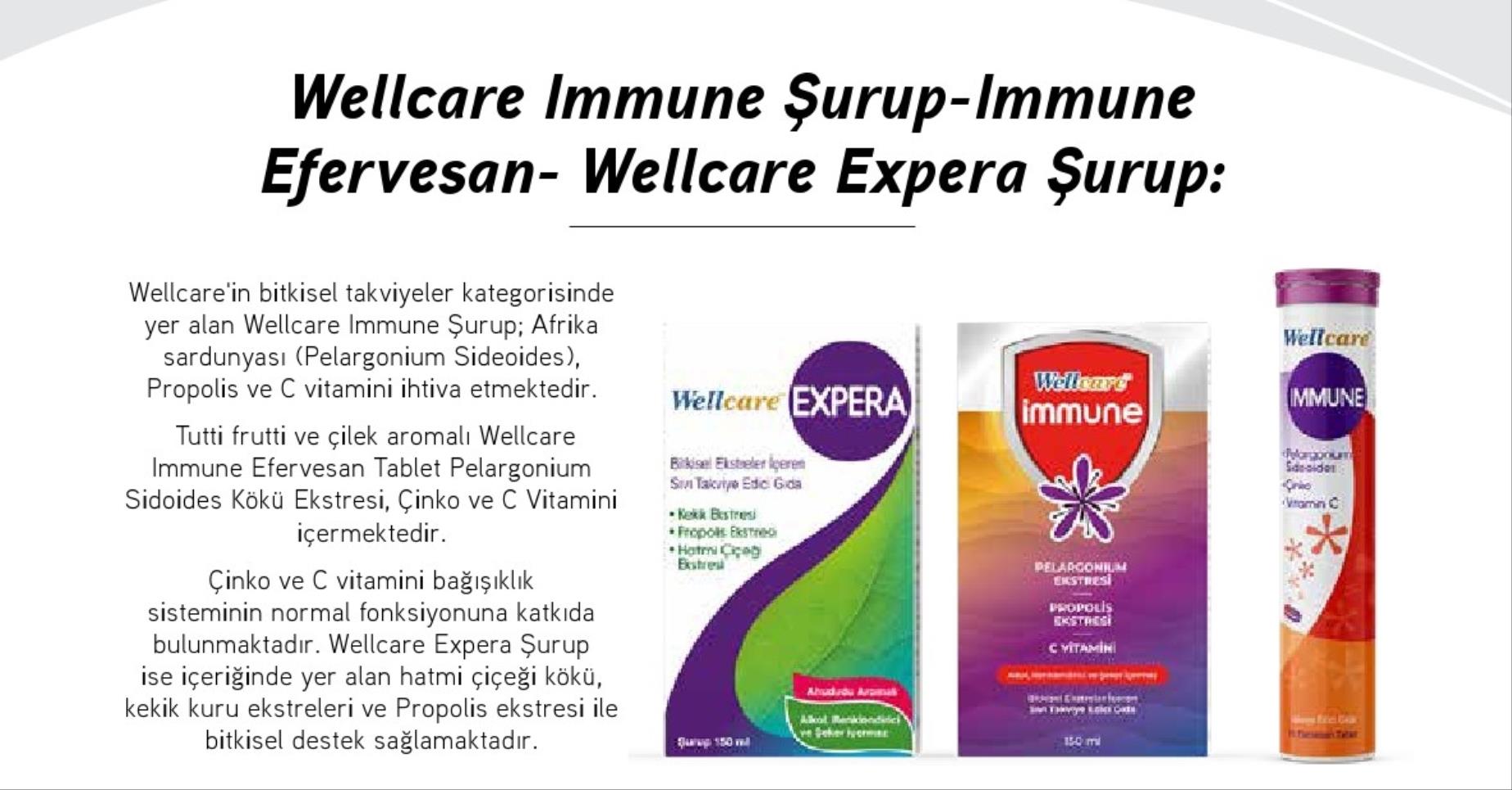 Wellcare'in bitkisel takviyeler kategorisinde yer alan Wellcare Immune Şurup; Afrika sardunyası (Pelargonium Sideoides), Propolis ve C vitamini ihtiva etmektedir. Tutti frutti ve çilek aromalı Wellcare Immune Efervesan Tablet Pelargonium Sidoides Kökü Ekstresi, Çinko ve C Vitamini içermektedir. Çinko ve C vitamini bağışıklık sisteminin normal fonksiyonuna katkıda bulunmaktadır. Wellcare Expera Şurup ise içeriğinde yer alan hatmi çiçeği kökü, kekik kuru ekstreleri ve Propolis ekstresi ile bitkisel destek sağlamaktadır.