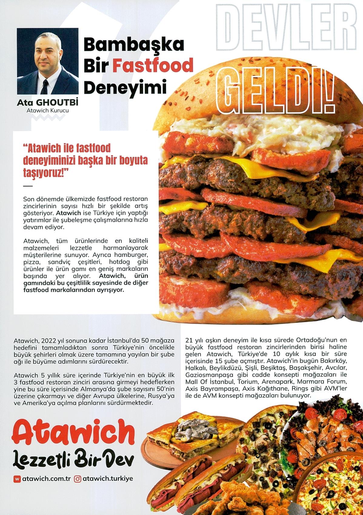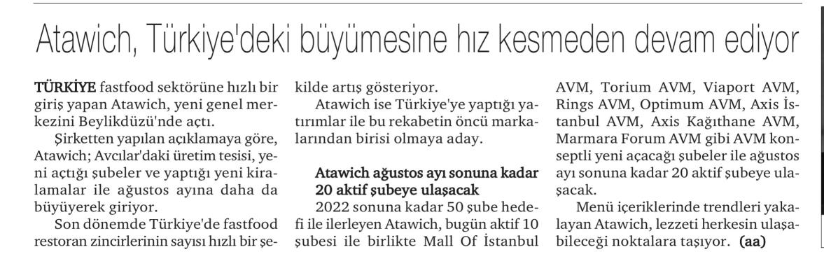 Atavvich, Türkiye'deki büyümesine hız kesmeden devam ediyor TÜRKİYE fastfood sektörüne hızlı bir giriş yapan Atavvich, yeni genel merkezini Beylikdüzü'nde açtı. Şirketten yapılan açıklamaya göre, Atawich; Avcılar'daki üretim tesisi, yeni açtığı şubeler ve yaptığı yeni kiralamalar ile ağustos ayına daha da büyüyerek giriyor. Son dönemde Türkiye'de fastfood restoran zincirlerinin sayısı hızlı bir şekilde artış gösteriyor. Atawich ise Türkiye'ye yaptığı yatırımlar ile bu rekabetin öncü markalarından birisi olmaya aday. Atavvich ağustos ayı sonuna kadar 20 aktif şubeye ulaşacak 2022 sonuna kadar 50 şube hedefi ile ilerleyen Atavvich, bugün aktif 10 şubesi ile birlikte Mail Of İstanbul AVM, Torium AVM, Viaport AVM, Rings AVM, Optimum AVM, Axis İstanbul AVM, Axis Kağıthane AVM, Marmara Forum AVM gibi AVM konseptli yeni açacağı şubeler ile ağustos ayı sonuna kadar 20 aktif şubeye ulaşacak. Menü içeriklerinde trendleri yakalayan Atavvich, lezzeti herkesin ulaşabileceği noktalara taşıyor,