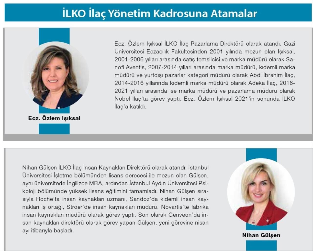 İLKO İlaç yönetim kadrosuna yaptığı atamalar ile güçlenmeye devam ediyor. Ecz. Özlem Işıksal Pazarlama Direktörü ve Nihan Gülsen ise İnsan Kaynaklan Direktörü olarak İLKO llaç'ta görev yapmaya başladı.
